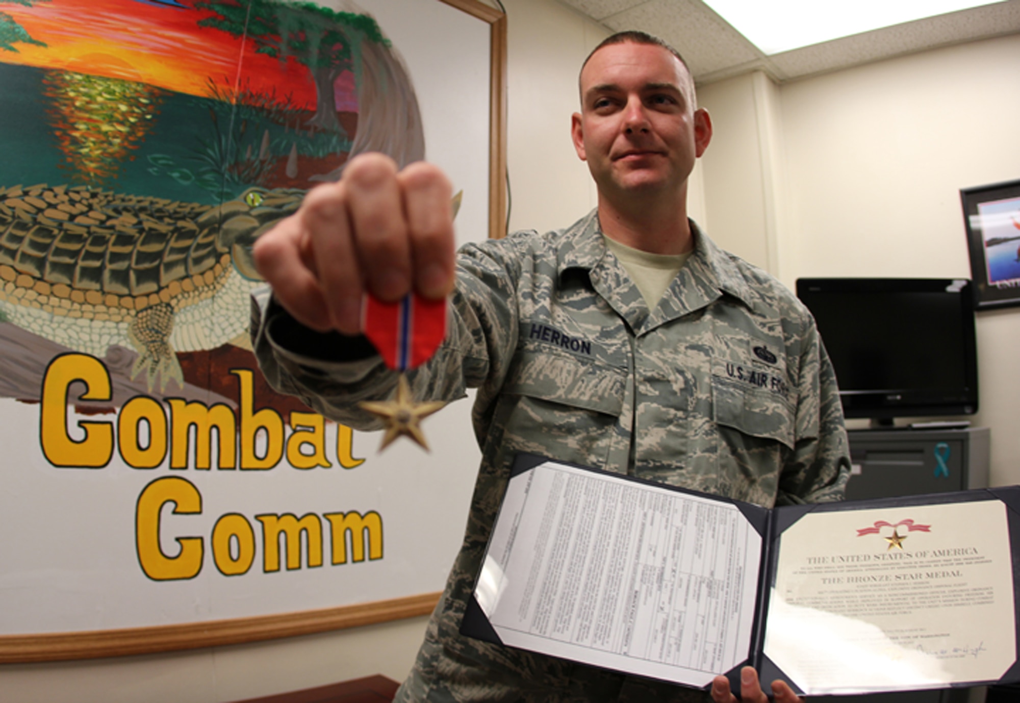 Staff Sgt. Stephen Herron proudly shows his Bronze Star medal and citation in the 52nd Combat Communications Squadron front office. Staff Sgt. Herron was presented the Bronze Star medal for achievement at a field commanders call. Herron received the award for his efforts during his 7-month deployment in support of forward deployed EOD teams. (U.S. Air Force photo by Robert Talenti)