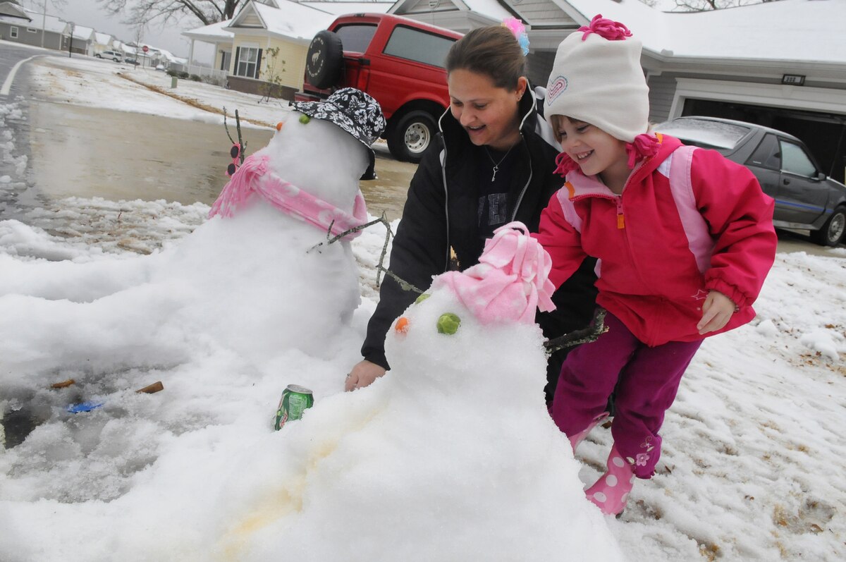 Rasberry and Jessica Surles, wife and daughter of Marine Gunnery Sgt. Brad Surles, work on a snowman and snowdog Monday at their home on Robins. In addition to children having the day off from school due to the inclement weather, non-mission essential base personnel were told not to report to work. U. S. Air Force photo by Sue Sapp