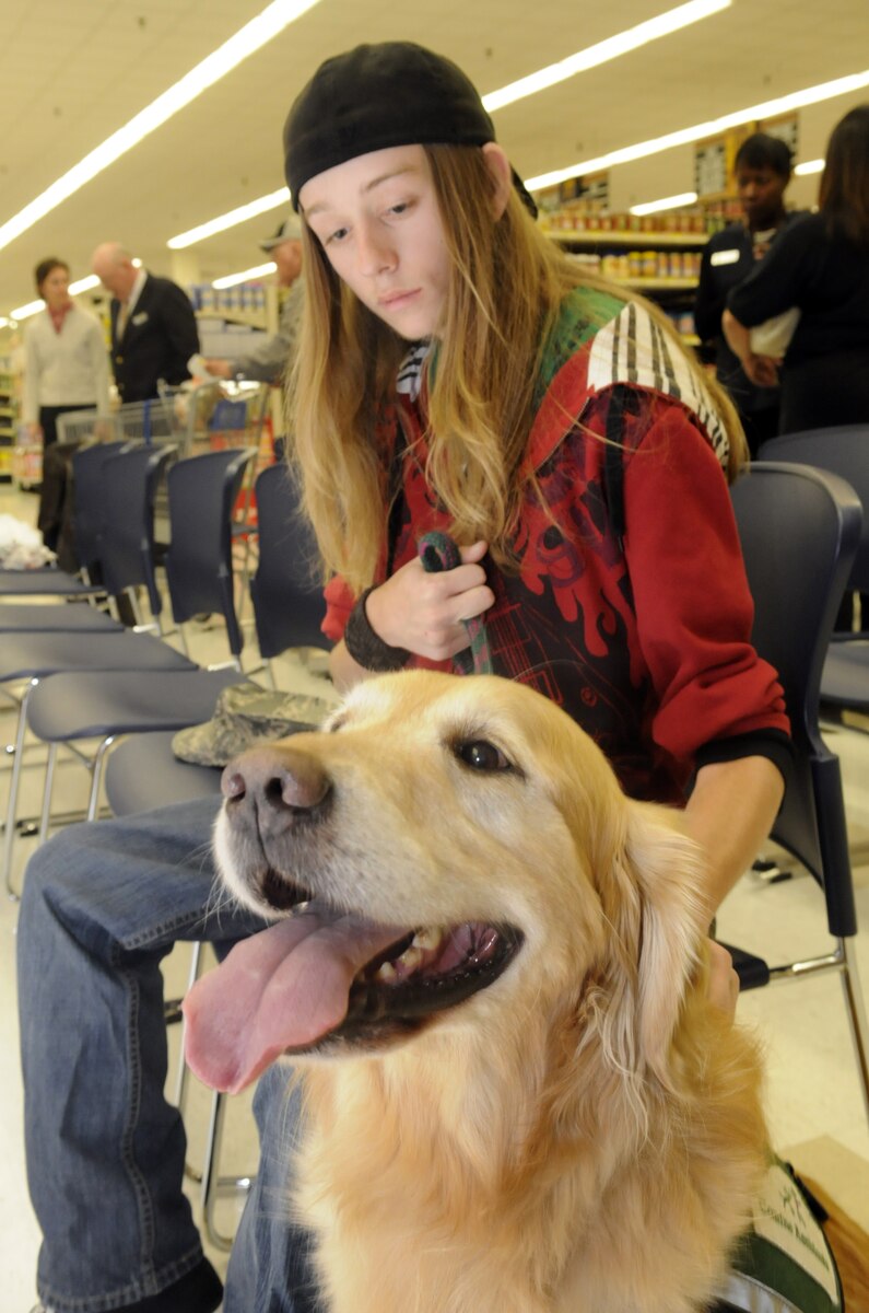 Hayden Martin, center, cuts a cake in his honor at a ceremony at Robins Commissary Feb. 26 as Marie Berry, Connor Martin, Dede Martin and Paula Lewis look on. Hayden will be getting his own service dog through a partnership between Milk-Bone and the Defense Commissary Agency. U. S. Air Force photo by Sue Sapp