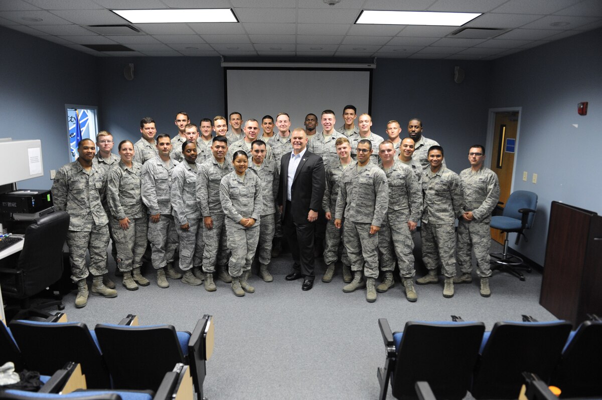 Senior Airman Kristian-Alan Amoranto, 78th Security Forces Squadron combat arms instructor, takes a selfie with retired Chief Master Sgt. of the Air Force James Roy during his recent visit to Robins. Roy, who served as the 16th Chief Master Sergeant of the Air Force, spoke to local Airman Leadership School students, June 27, 2016 prior to their graduation June 28. (U.S. Air Force photo by Tommie Horton)