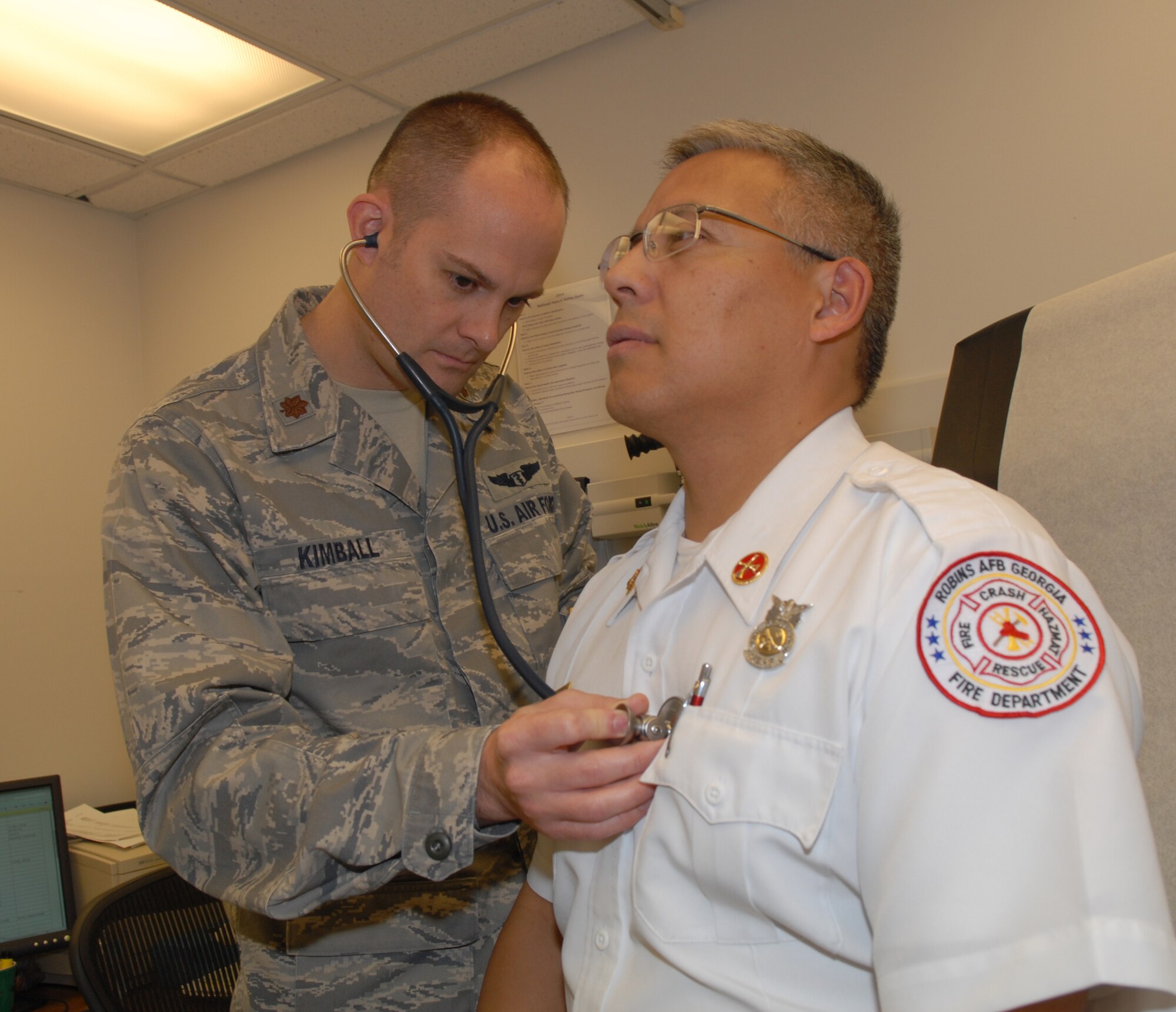 Maj. Stanley Kimball, Occupational Medicine Services deputy director, conducts an annual physical exam on Lupe J.A. Diaz, 78th Civil Engineer Group Fire Department engineering technician, at the OMS clinic. Some occupations on base require annual exams as requirements for employment. (U.S. Air Force photo/Misuzu Allen)