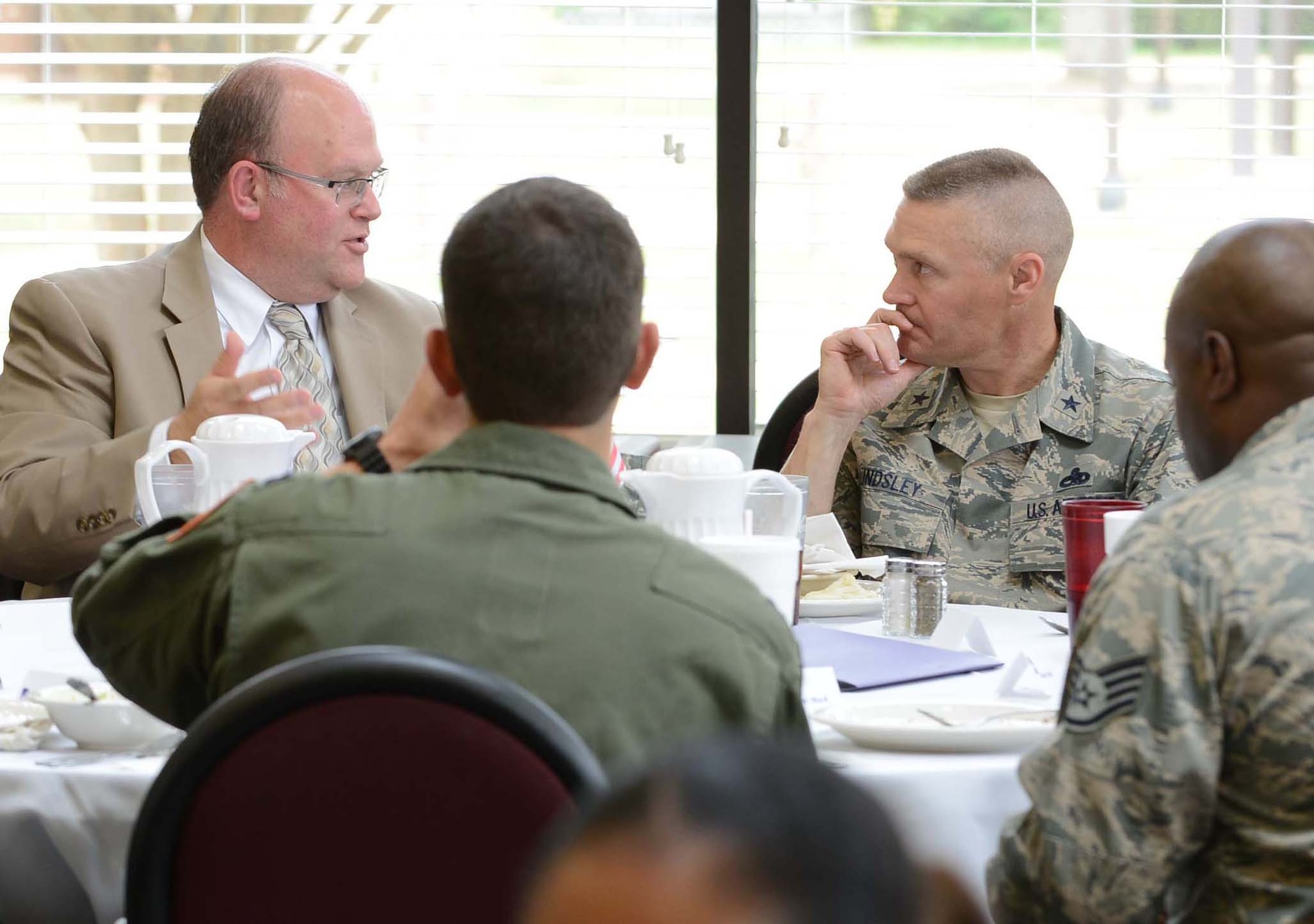 Steve Petersen, military legislative assistant for Congressman Rob Bishop, chats with Brig. Gen. Walter Lindsley, Warner Robins Air Logistics Complex commander, at Wynn Dining Facility. Sept. 25, 2014. While here, the Air Force staff delegation received a cross-sectional view of Team Robins’ mission. (U. S. Air Force photo by Tommie Horton)