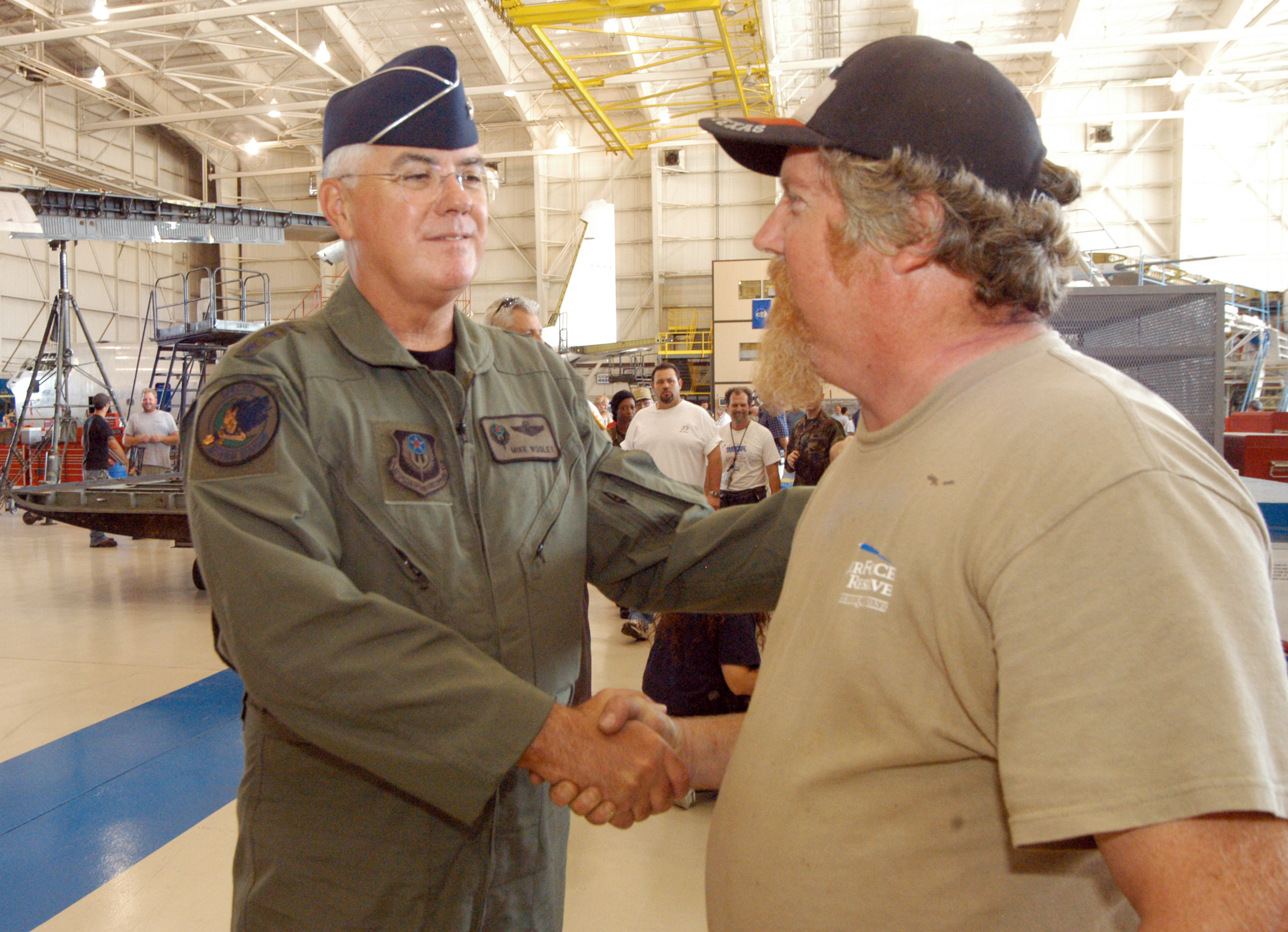 Lt. Gen. Michael Wooley, Commander, Headquarters Special Operations Command, Hurlburt Field, Fla., shakes hands with Chuck "Tex" Hannah, C-130 sheetmetal lead mechanic, July 5. The general thanked all the C-130 support workers and congratulated them on the excellent job they are doing in support of Special Operations Command. In June, Robins returned a MC-130 H Combat Talon II aircraft 53 days early after receiving a new center wing box and program depot maintenance. The center wing box replacement was the first one for a Combat Talon II. The aircraft was returned to the 1st Special Operations Wing, part of Air Force Special Operations Command and immediately flew new missions. The Combat Talon II center wing box replacement also signaled the end of the first phase of the C-130 center wing box replacement program, which will continue to bring workload to Robins including aircraft such as the HC-130P and HC-130N, both of which are combat search and rescue versions of the C-130 Hercules transport. U. S. Air Force photo by Sue Sapp