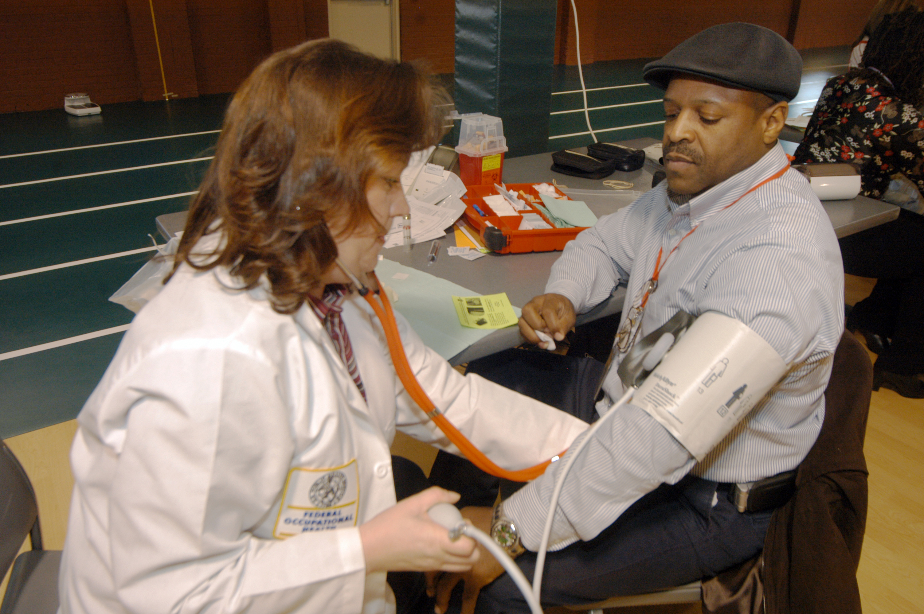 Kelley Denney, RN with Civilian Health Promotion Service, does a blood pressure check on Bobby Mosley, 573rd Aircraft Sustainment Squadron, Wednesday during a Cardiac Risk Screening at the fitness center annex in Bldg. 301. The free screening checked blood pressure, cholesterol and blood sugar and a provided a body mass index calculation. To schedule a free health screening in your work area contact Kelley Denney, RN, CHPS, at 327-8030. U.S. Air Force photo by Sue Sapp.
